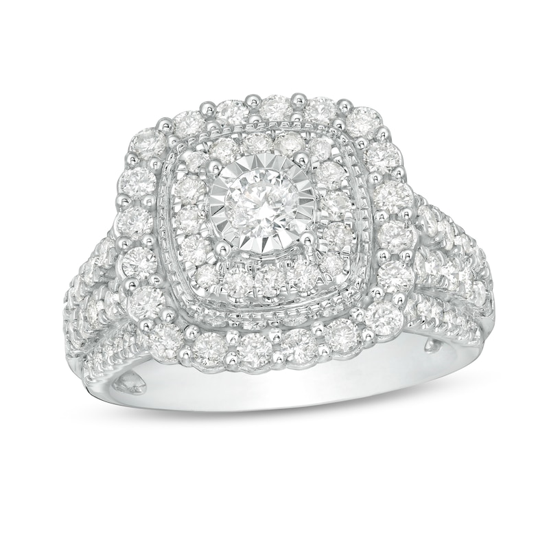 Give her a beautiful symbol of your love with this remarkable diamond engagement ring. Fashioned in cool 10K white gold, this spectacular design features a 1/5 ct. diamond – artfully set to enhance size and sparkle – wrapped in a double cushion-shaped frame of diamonds and intricate milgrain detailing. The split shank shimmers with four rows of diamonds to complete the style. Captivating with 1-1/2 cts. t.w. of diamonds and a brilliant buffed luster, this engagement ring is worthy of her affection.