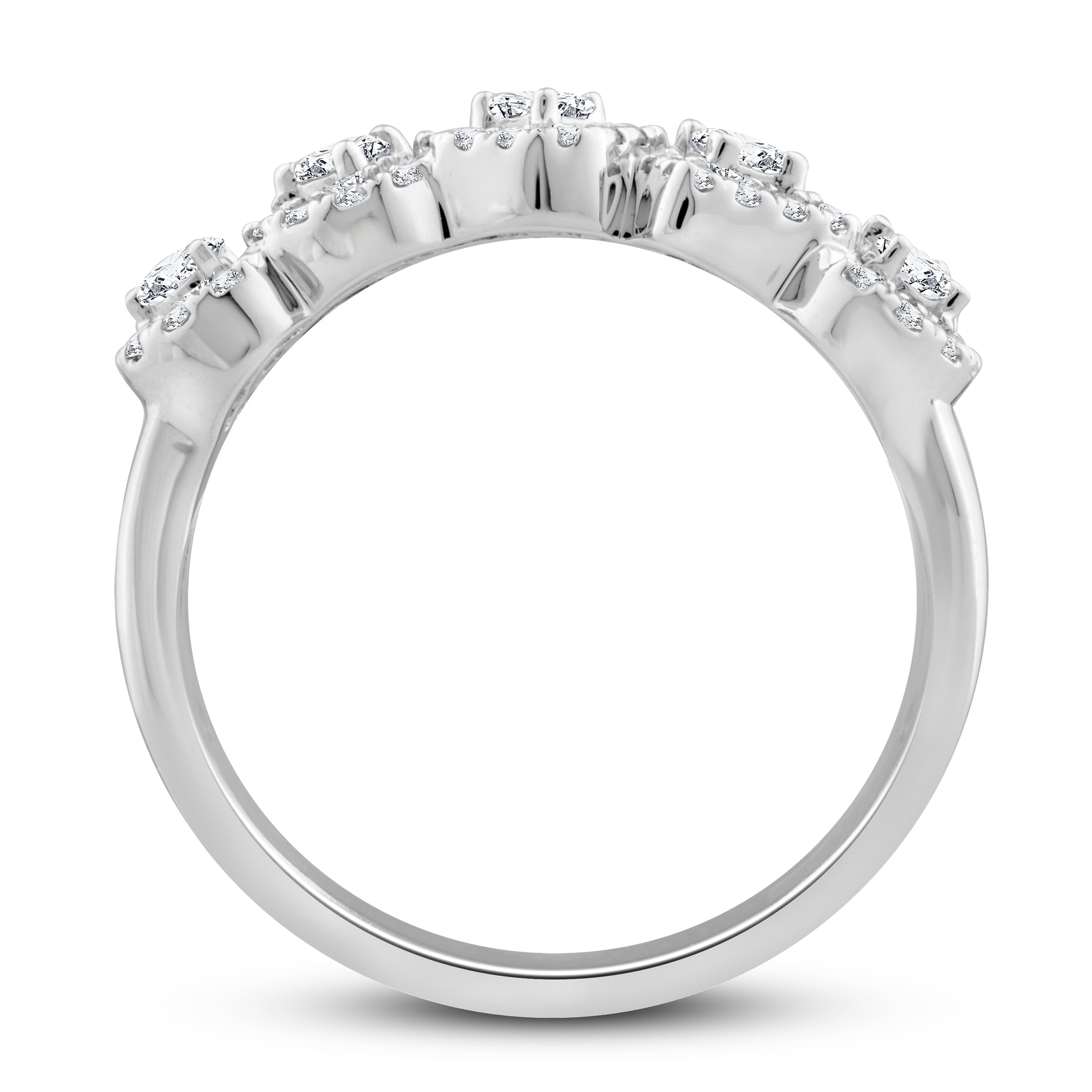 This striking diamond ring collection features five distinctively-shaped diamonds, symbolic of everything she means to you. Each diamond shape has a different meaning, from integrity and wisdom, to confidence, totality, and elegance. This gorgeous 10K white gold ring features a pear-shaped, round-cut, emerald-cut, princess-cut, and oval-cut diamond, each surrounded by a frame of sparkling round-cut diamonds. The ring has a total diamond weight of 1/2 carat.