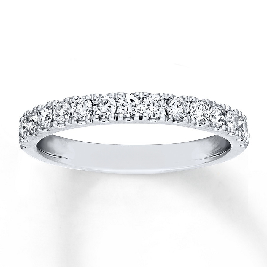 With sparkling round diamonds totaling 1/2 carat in weight, this wedding band is a wonderful way to symbolize your commitment. The 14K white gold ring is designed to accompany her matching engagement ring (sold separately).